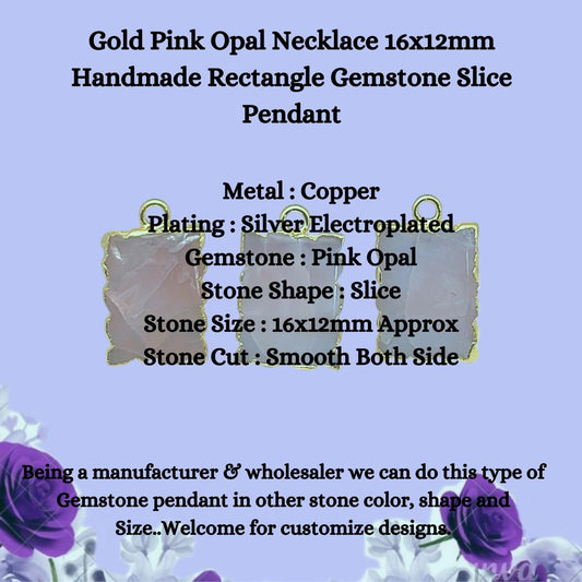 Gold Pink Opal Necklace 16x12mm Handmade Rectangle Gemstone Slice Pendant