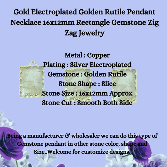 Gold Electroplated Golden Rutile Pendant Necklace 16x12mm Rectangle Gemstone Zig Zag Jewelry