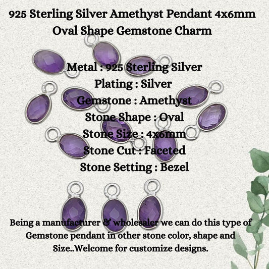 925 Sterling Silver Amethyst Pendant 4x6mm Oval Shape Gemstone Charm