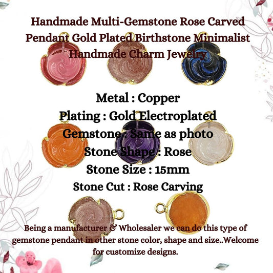 Handmade Multi-Gemstone Rose Carved Pendant Gold Plated Birthstone Minimalist Handmade Charm Jewelry for Women- Selling Per Piece