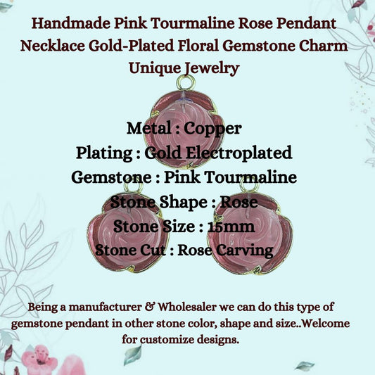 Handmade Pink Tourmaline Rose Pendant Necklace Gold-Plated Floral Gemstone Charm Unique Jewelry Gift for Mother’s Day- Selling Per Piece