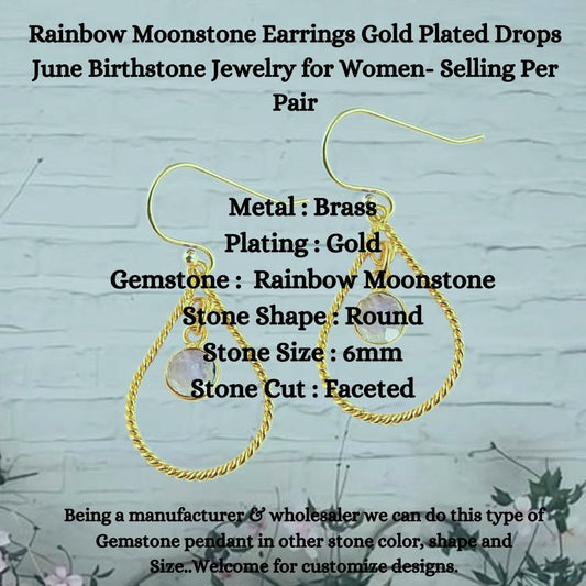 Moonstone Earrings Gold Plated Drops June Birthstone Jewelry for Women- Selling Per Pair
