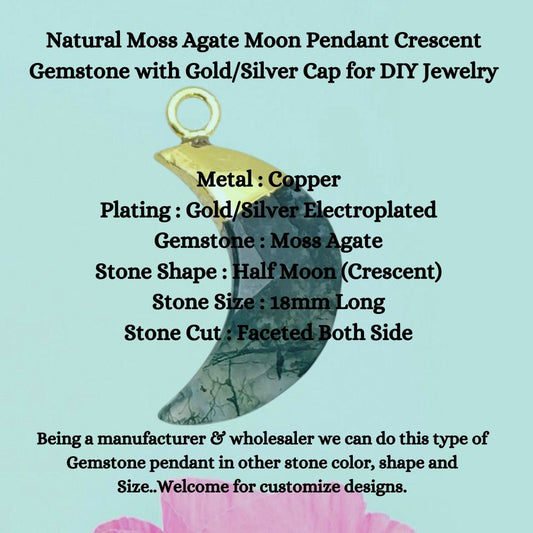 Natural Moss Agate Moon Pendant Crescent Gemstone with Gold/Silver Cap for DIY Jewelry