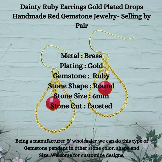Dainty Ruby Earrings Gold Plated Drops Handmade Red Gemstone Jewelry- Selling by Pair