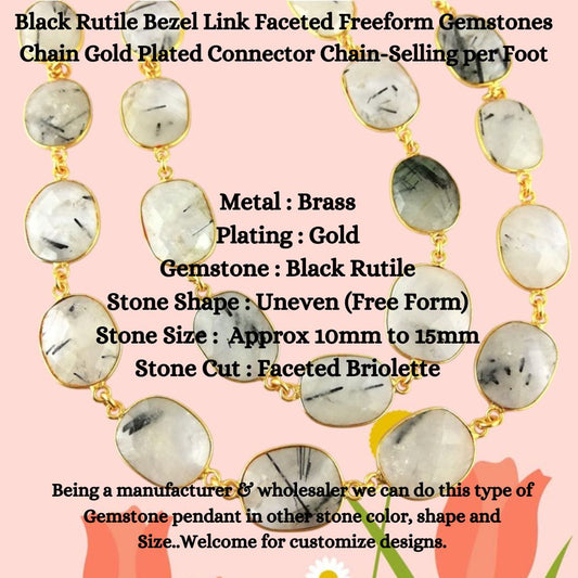 Black Rutile Bezel Link Faceted Freeform Gemstones Chain Gold Plated Connector Chain-Selling per Foot