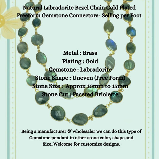 Natural Labradorite Bezel Chain Gold Plated Freeform Gemstone Connectors- Selling per Foot