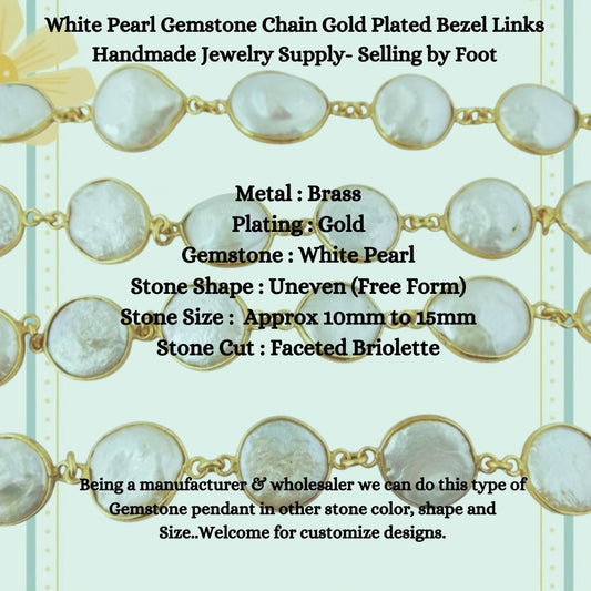 White Pearl Gemstone Chain Gold Plated Bezel Links Handmade Jewelry Supply- Selling by Foot