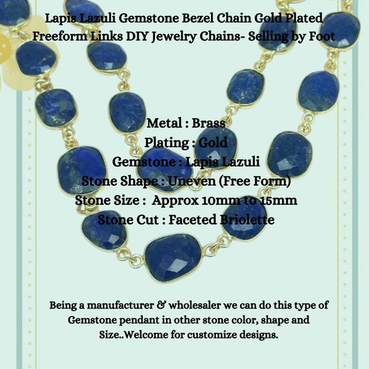 Lapis Lazuli Gemstone Bezel Chain Gold Plated Freeform Links DIY Jewelry Chains- Selling by Foot