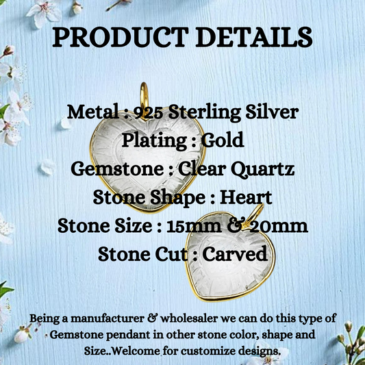 Elegant Clear Quartz Heart Pendant Handmade Gemstone Jewelry in Gold Plated Sterling Silver- Selling Per Piece