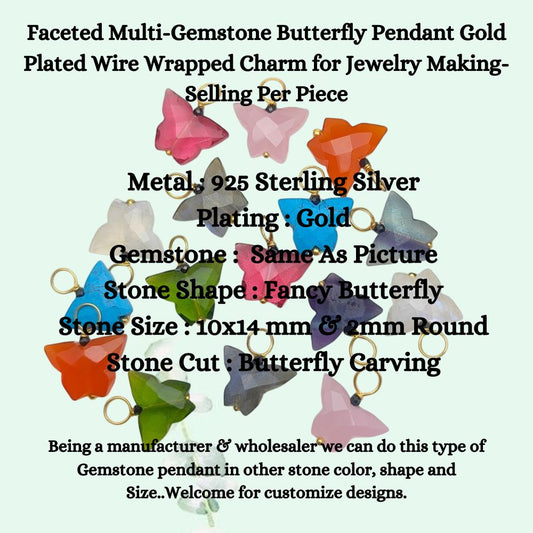 Faceted Multi-Gemstone Butterfly Pendant Gold Plated Wire Wrapped Charm for Jewelry Making- Selling Per Piece