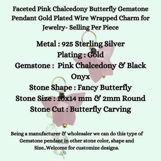 Faceted Pink Chalcedony Butterfly Gemstone Pendant Gold Plated Wire Wrapped Charm for Jewelry- Selling Per Piece