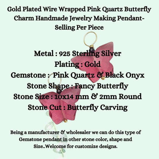 Gold Plated Wire Wrapped Pink Quartz Butterfly Charm Handmade Jewelry Making Pendant- Selling Per Piece