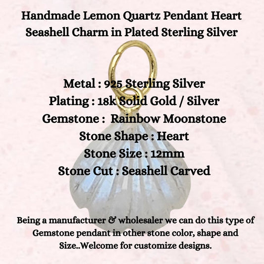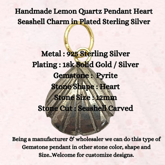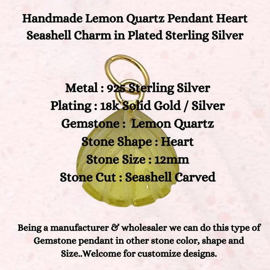 Handmade Lemon Quartz Pendant Heart Seashell Charm in Plated Sterling Silver