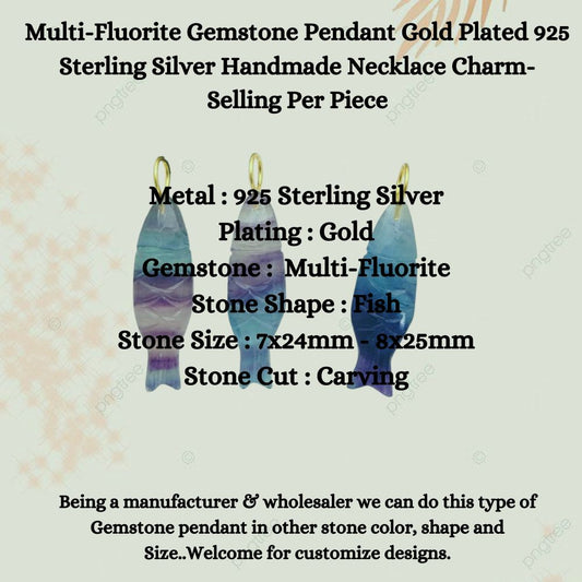Multi-Fluorite Gemstone Fish Pendant Gold Plated 925 Sterling Silver Handmade Necklace Charm- Selling Per Piece