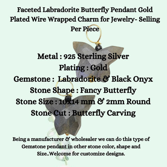 Faceted Labradorite Butterfly Pendant Gold Plated Wire Wrapped Charm for Jewelry- Selling Per Piece