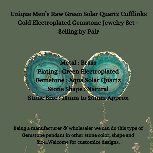 Unique Men’s Raw Green Solar Quartz Cufflinks Gold Electroplated Gemstone Jewelry Set – Selling by Pair