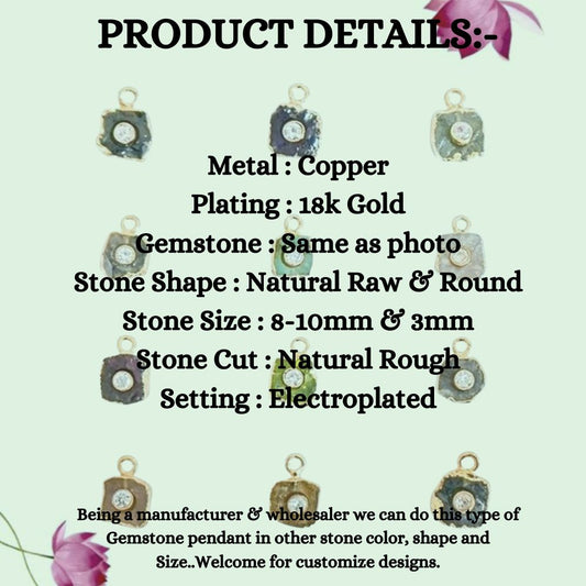 Natural Raw Gemstone Birthstone Pendant with CZ 18k Gold Electroplated Handmade Charm- Selling Per Piece