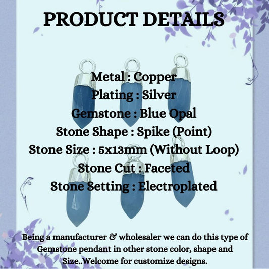 Natural Blue Opal Spike Pendant with Silver Electroplated Cap Handmade Healing Gemstone Charm for DIY Boho Jewelry – Selling Per Piece