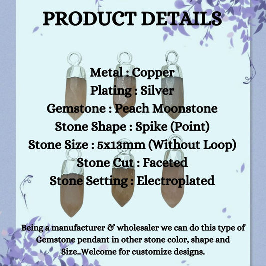 Natural Peach Moonstone Spike Pendant with Silver Electroplated Cap Handmade Healing Gemstone Charm for DIY Boho Jewelry – Selling Per Piece