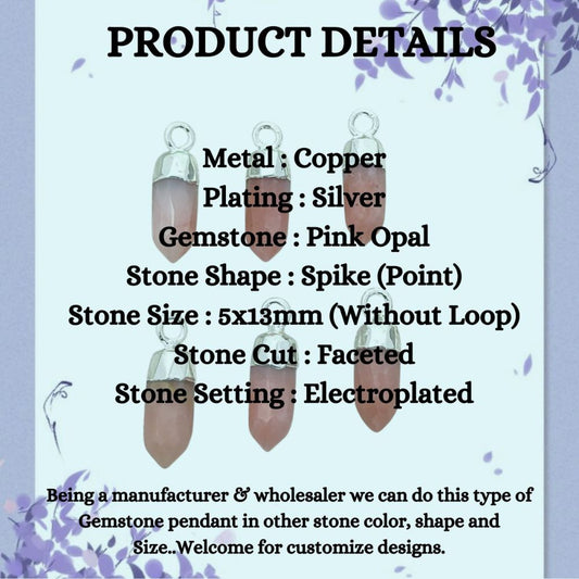 Handcrafted Pink Opal Crystal Spike Point Pendant Silver-Plated Gemstone Charm for Minimalist Necklace & Bracelet Designs – Selling Per Piece