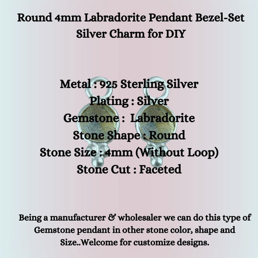 Round 4mm Labradorite Pendant Bezel-Set Silver Charm for DIY
