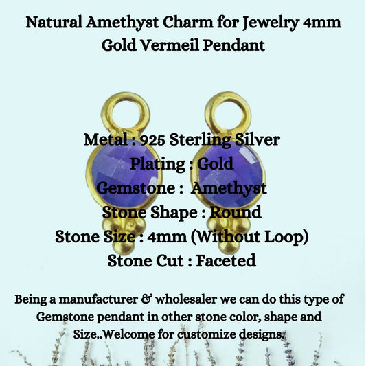 Natural Amethyst Charm for Jewelry 4mm Gold Vermeil Pendant
