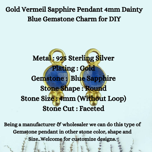 Gold Vermeil Sapphire Pendant 4mm Dainty Blue Gemstone Charm for DIY