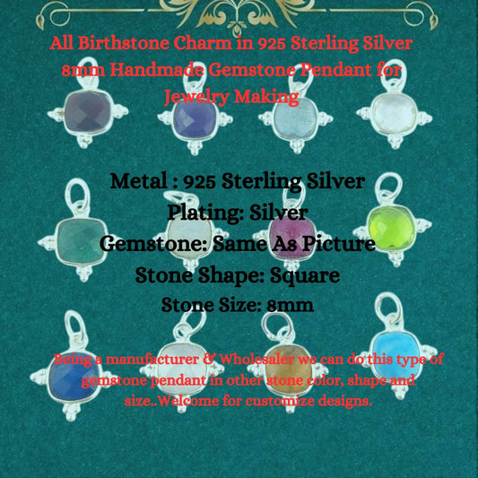Square All Birthstone Charm in 925 Sterling Silver 8mm Handmade Gemstone Pendant for Jewelry Making- Selling Per Piece