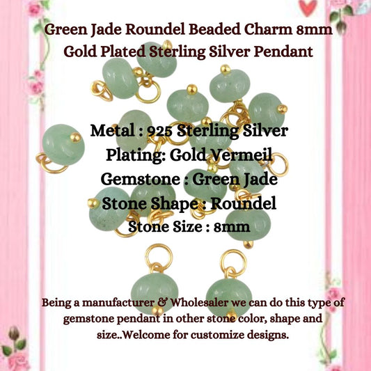 Green Jade Roundel Beaded Charm 8mm Gold Plated Sterling Silver Pendant for Earrings & Necklaces- Selling Per Piece