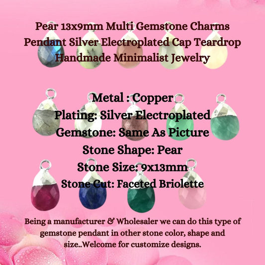 Pear 13x9mm Multi Gemstone Charms Pendant Silver Electroplated Cap Teardrop Handmade Minimalist Jewelry- Selling Per Piece