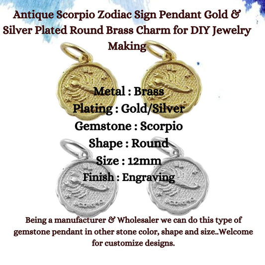 Antique Scorpio Zodiac Sign Pendant Gold & Silver Plated Round Brass Charm for DIY Jewelry Making- Selling Per Piece