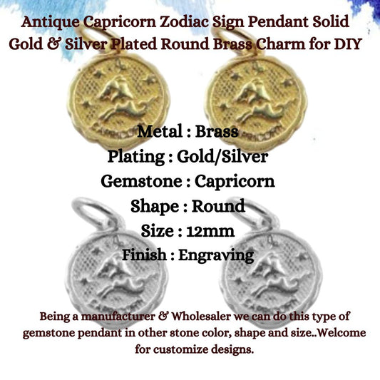 Antique Capricorn Zodiac Sign Pendant Solid Gold & Silver Plated Round Brass Charm for DIY Jewelry Making- Selling Per Piece