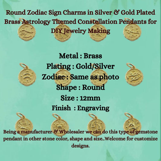 Round Zodiac Sign Charms in Silver & Gold Plated Brass Astrology Themed Constellation Pendants for DIY Jewelry Making- Selling/Piece