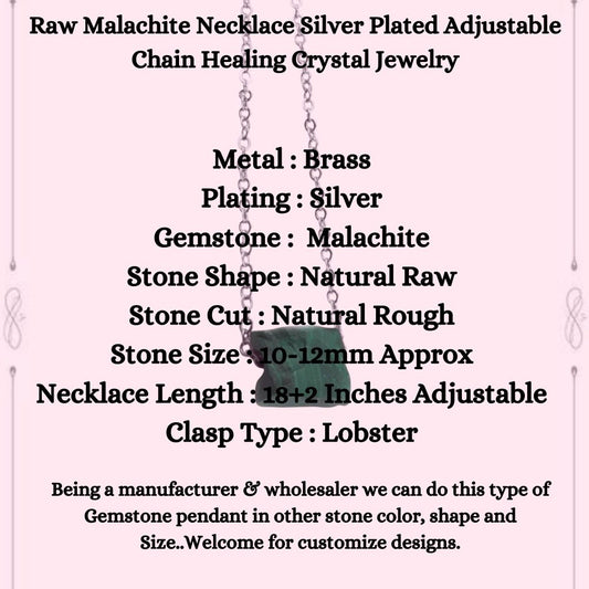 Raw Malachite Necklace Silver Plated Adjustable Chain Healing Crystal Jewelry