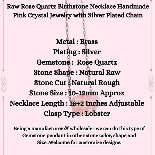 Raw Rose Quartz Birthstone Necklace Handmade Pink Crystal Jewelry with Silver Plated Chain