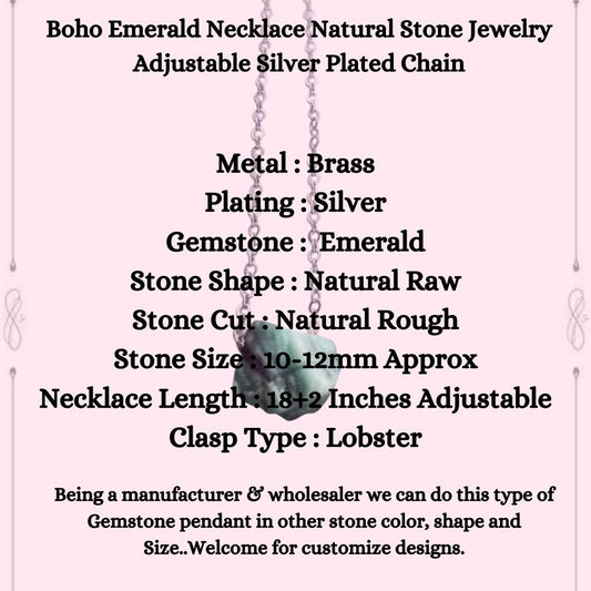 Boho Emerald Necklace Natural Stone Jewelry Adjustable Silver Plated Chain