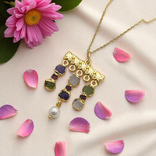 Boho Multi Gemstone Necklace with Freshwater Pearls & Raw Birthstones Peridot & Garnet Healing Crystal Jewelry for Women