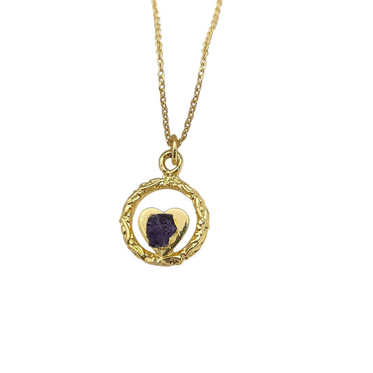 Raw Amethyst Heart Pendant Necklace with Ring Design February Birthstone Gold Plated Jewelry for Women