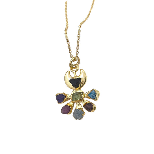 Floral Crescent Moon Necklace with Raw Multicolor Gemstones Handmade Birthstone Jewelry Gift for Her