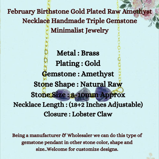 February Birthstone Gold Plated Raw Amethyst Necklace Handmade Triple Gemstone Minimalist Jewelry for Gift- Selling per Piece