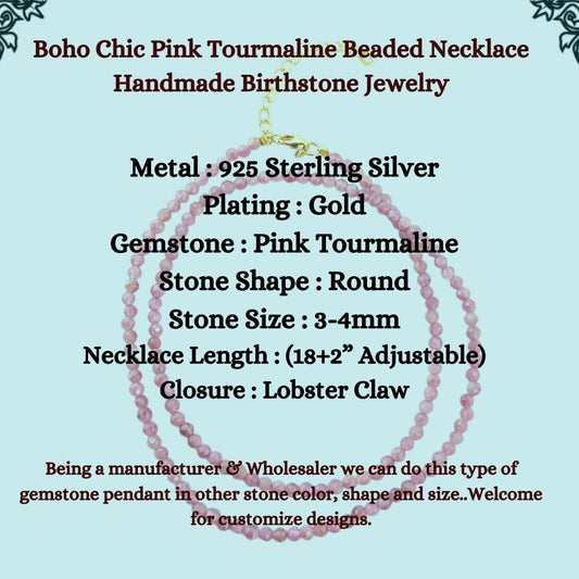 Boho Chic Pink Tourmaline Beaded Necklace Handmade Birthstone Jewelry Gold Plated Silver Statement Necklace for Anniversary (Adjustable 18+2 Inch Chain) – Selling/Piece