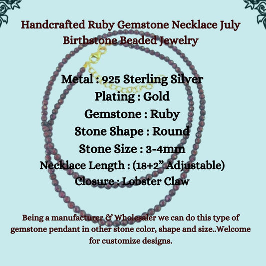 Handcrafted Ruby Gemstone Necklace July Birthstone Beaded Jewelry Gold Plated Sterling Silver Boho Chic Statement Necklace (Adjustable 18+2 Inch Chain) – Selling/Piece