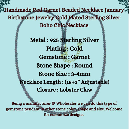 Handmade Red Garnet Beaded Necklace January Birthstone Jewelry Gold Plated Sterling Silver Boho Chic Necklace (18+2 Inch Adjustable Chain) - Selling/Piece