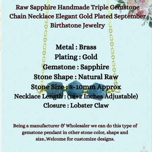 Raw Sapphire Handmade Triple Gemstone Chain Necklace Elegant Gold Plated September Birthstone Jewelry Gift- Selling Per Piece