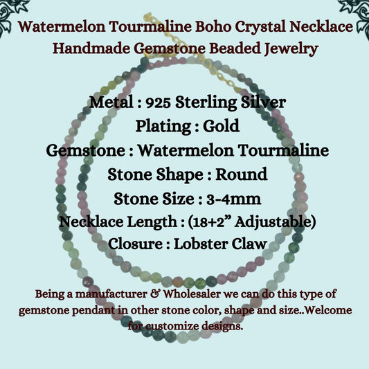 Watermelon Tourmaline Boho Crystal Necklace Handmade Gemstone Beaded Jewelry Gold Plated Sterling Silver Necklace for Women (Adjustable 18+2 Inch Chain) – Selling/Piece