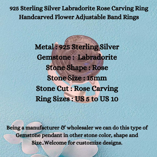 925 Sterling Silver Labradorite Rose Carving Ring Handcarved Flower Adjustable Band Rings