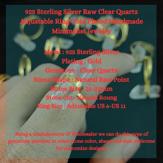 925 Sterling Silver Raw Clear Quartz Adjustable Ring Gold Plated Handmade Minimalist Jewelry For Women- Selling Per Piece