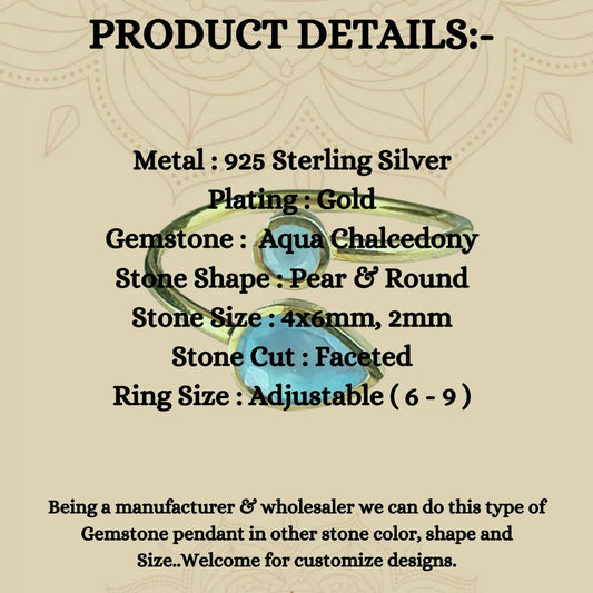 Adjustable Aqua Chalcedony Ring Gold Plated 925 Sterling Silver Open Band Double Gemstone Statement Jewelry