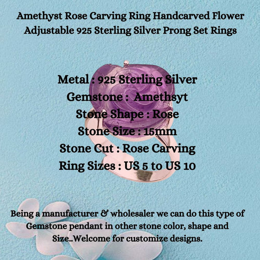 Amethyst Rose Carving Ring Handcarved Flower Adjustable 925 Sterling Silver Prong Set Rings