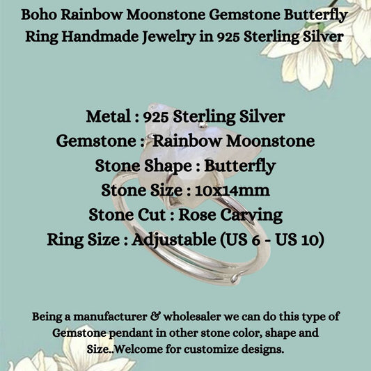 Boho Rainbow Moonstone Gemstone Butterfly Ring Handmade Jewelry in 925 Sterling Silver